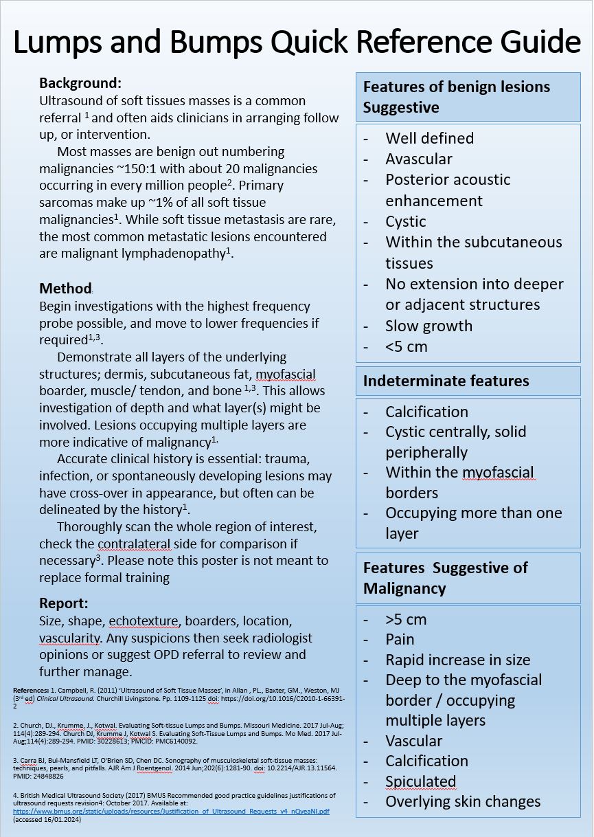 Many sonographers experience requests for lumps and bumps when this may not be their primary specialty, as such lack the confidence to report and image these effectively. This poster aims to offer sonographers with a resource which they can consult and provides them with support in the imaging and reporting of lumps and bumps. The poster covers example features of benign, intermediate and malignant lesions and offers advice on when to escalate findings. This poster should not replace formal Musculoskeletal (MSK) training, but can be used as a tool to support sonographers in clinical practice where their confidence might be lacking.